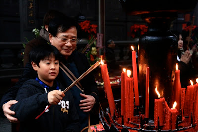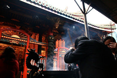 Longshan Temple 龍山寺 is incredibly crowded with the chanting faithfuls on New Year's Eve. The repetitive chanting in unison is hypnotic, and the incense smoke is almost suffocating.